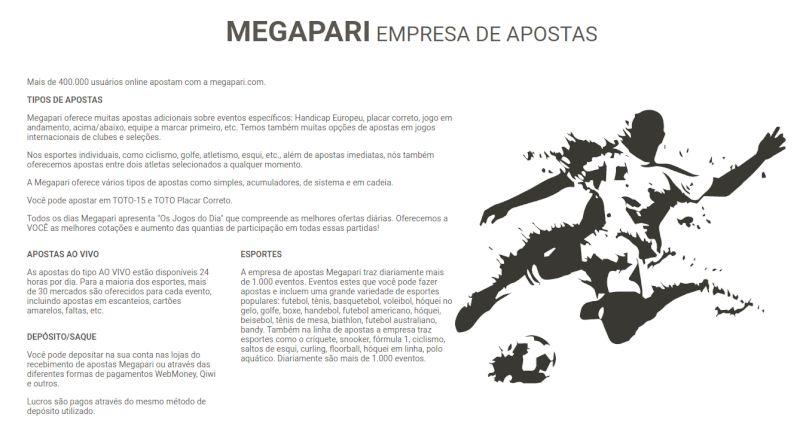 Iniciando suas atividades em 2007 o Megapari é um site de apostas relativamente jovem, mas com um portfólio bastante profissional e qualificado. Segundo dados da própria empresa, o serviço conta atualmente com mais de 400 mil utilizadores online apostando frequentemente.